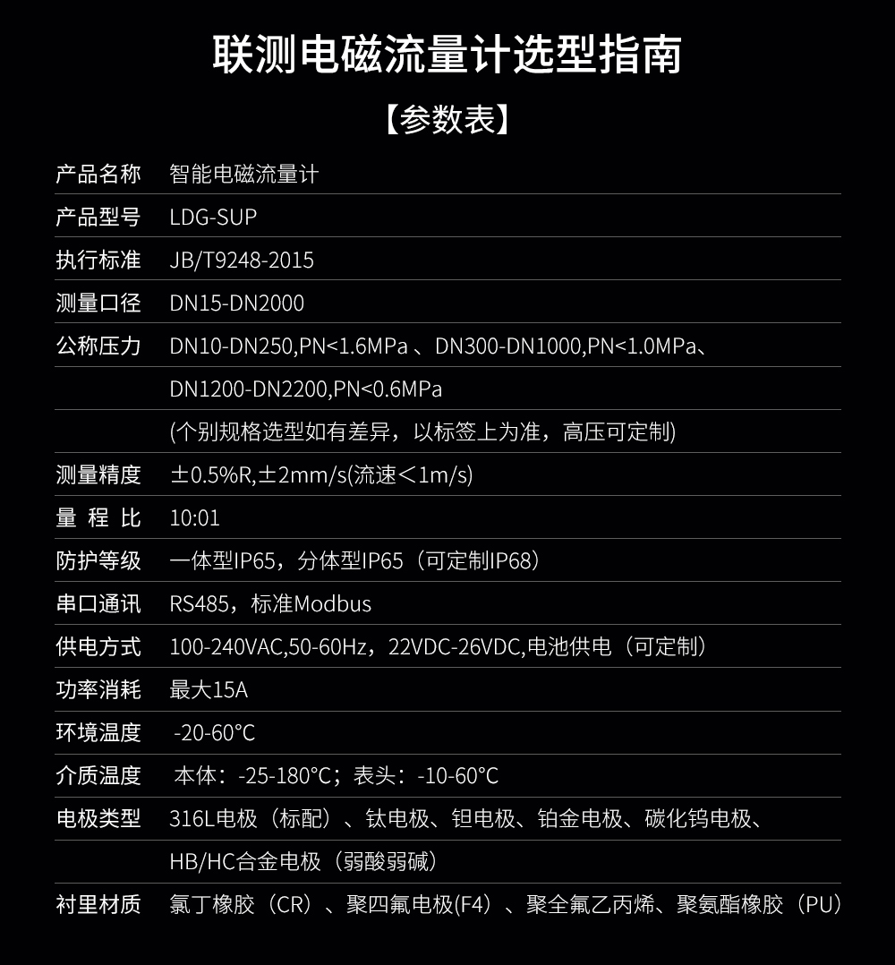 聯測LDG-SIN電磁流量計適用于化工助劑、海綿城市、給水排水、水利灌溉、水處理、污水處理(環保污水控制、化工污水、電鍍污水)、造紙漿液(紙漿)、泥漿、醫藥原料、食品等工農業的生產公司過程流量測量和控制,標配485通訊功能。