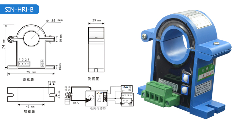 電流變送器可以直接將被測主回路交流電流或者直流電流轉換成按線性比例輸出的DC4~20mA(通過250Ω 電阻轉換DC 1~5V或通過500Ω電阻 轉換DC2~10V)恒流環標準信號,連續輸送到接收裝置(計算機或顯示儀表)。